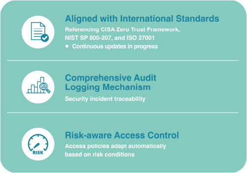 The system is aligned with global standards such as CISA Zero Trust Framework, NIST SP 800-207, and ISO 27001. It includes built-in audit logging, with geolocation awareness, organizations can automatically adapt access policies to contexts, strengthening auditability, risk control, and zero trust implementation.
