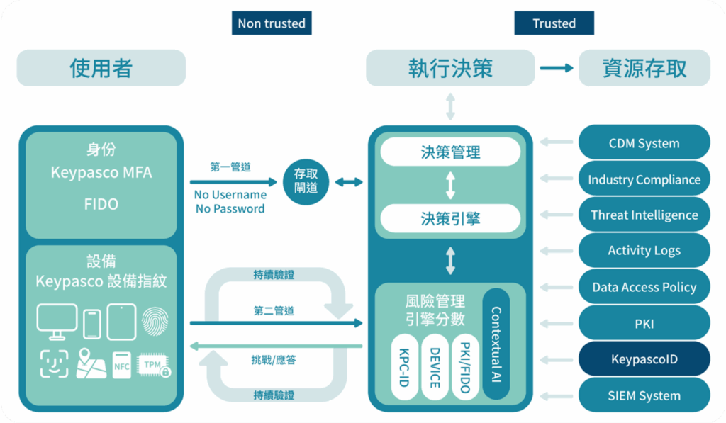 リソースポータル型デプロイメント(Resource Portal-Based Deployment)を採用し、Keypascoソリューションはデジタル庁およびNIST SP 800-207標準を参照し、ID認証、デバイス認証、信頼推定という三大メカニズムを統合し、クラウドおよびリモートアクセスのセキュリティを包括的に強化します。2チャンネル構造、デバイスフィンガープリント、リスク評価を通じて、機関が「ゼロトラスト」を実践できるよう支援し、既存アーキテクチャとシームレスに統合してIDおよびデバイス管理を強化し、ネットワークからアプリケーションまでの完全な信頼防御線を構築します。台湾のサイバーセキュリティ技術を代表する企業として、Keypascoは国内のゼロトラスト産業の発展を推進し、政府および大規模組織に対し、より堅固で柔軟な防御基盤を構築することに尽力しています。